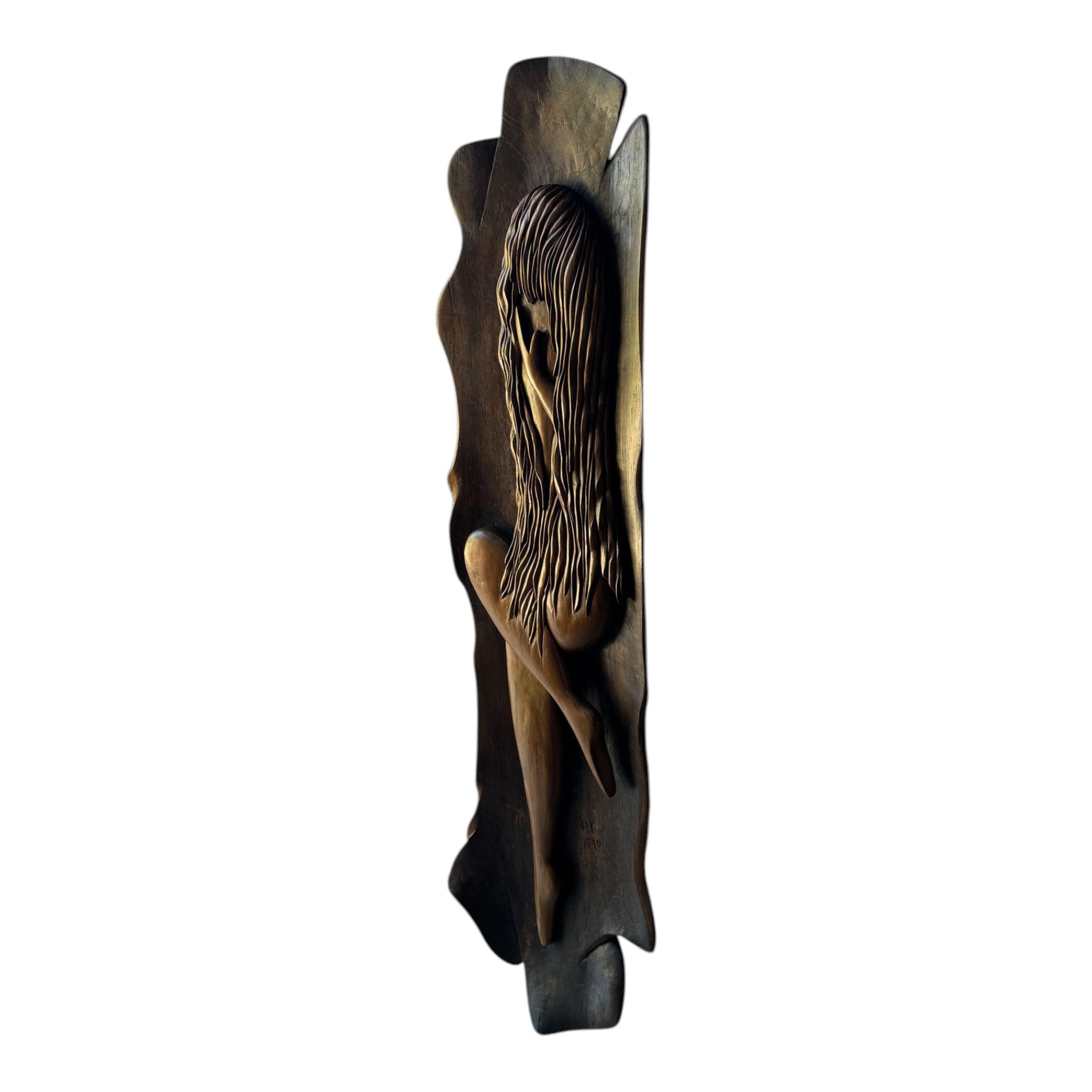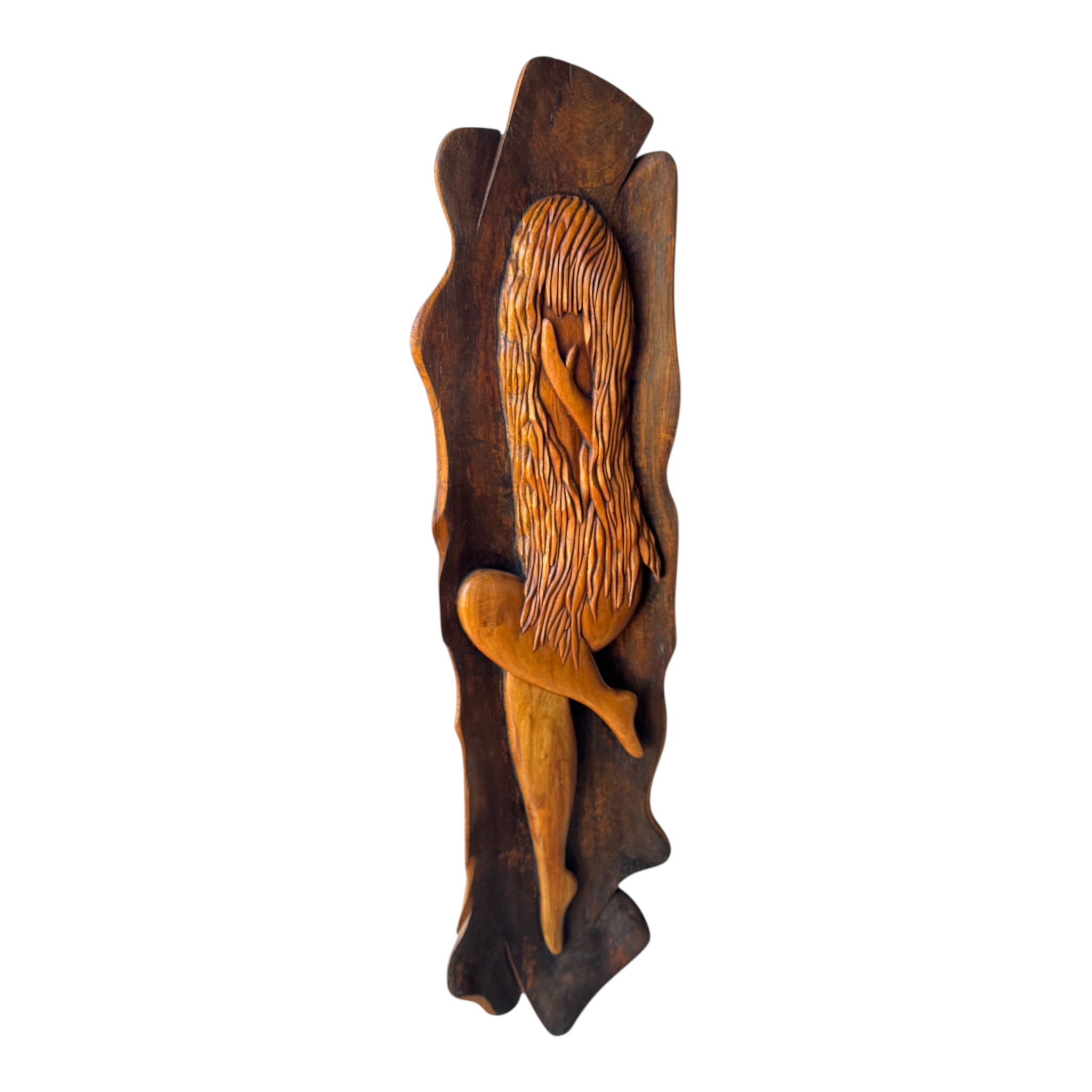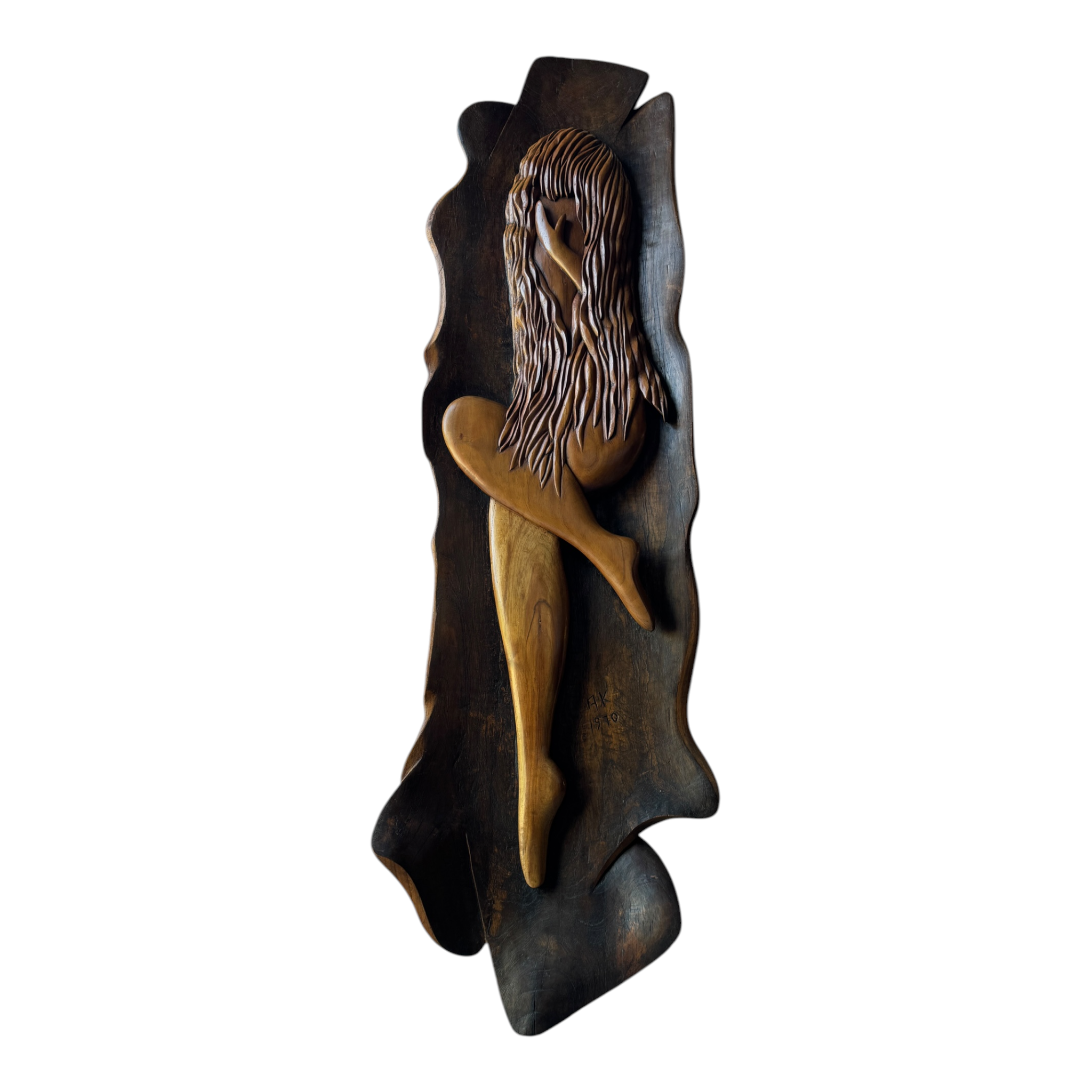 Esculpida a partir de una sola pieza de madera maciza, presenta un llamativo contraste de dos tonos que resalta la profundidad y la forma. El cuerpo de la mujer y su intrincado cabello están acabados en un tono de madera más claro y cálido, mientras que el fondo texturizado y orgánico está teñido en un rico nogal oscuro. La forma del panel de madera es libre e irregular, siguiendo la veta natural de la madera y enfatizando su origen artesanal.