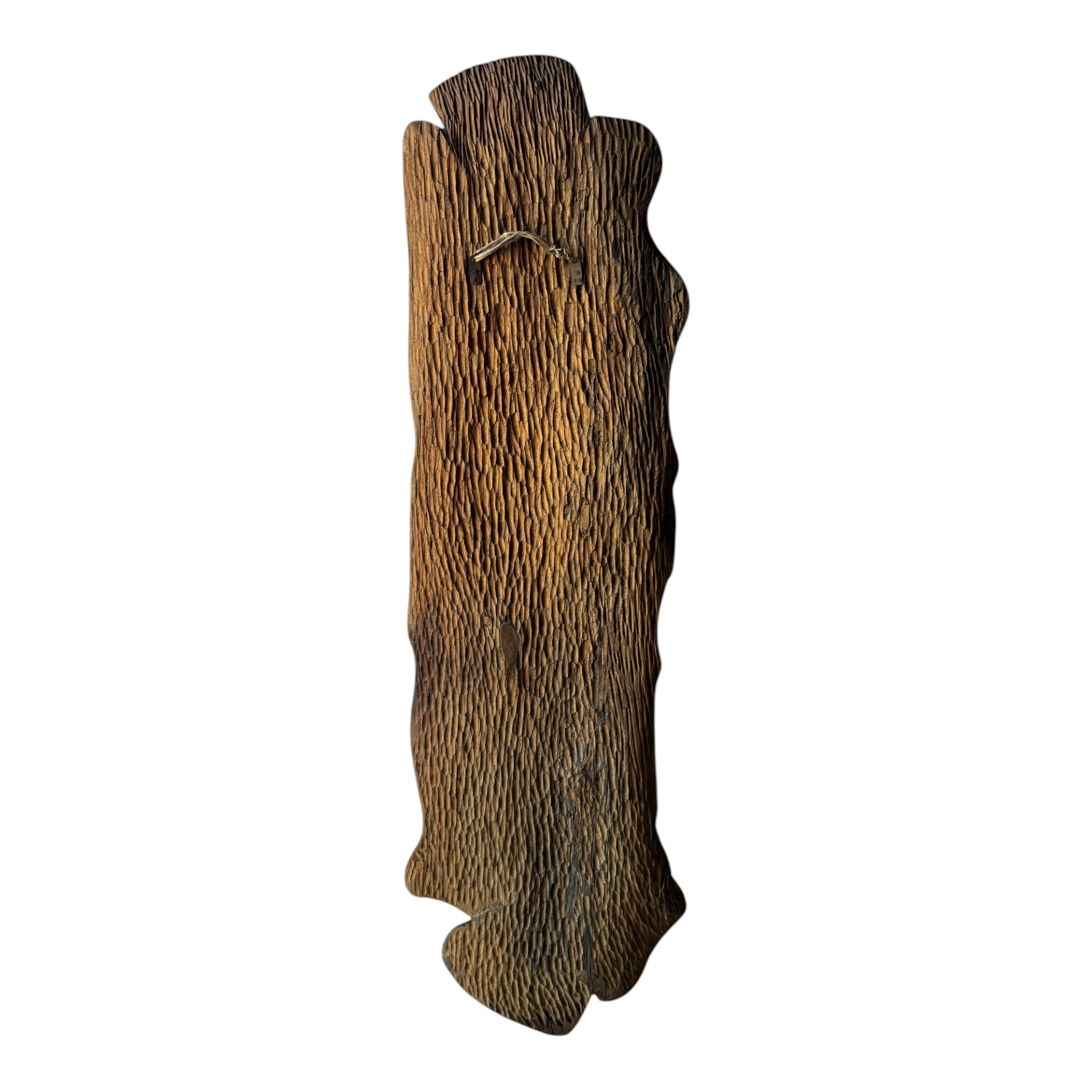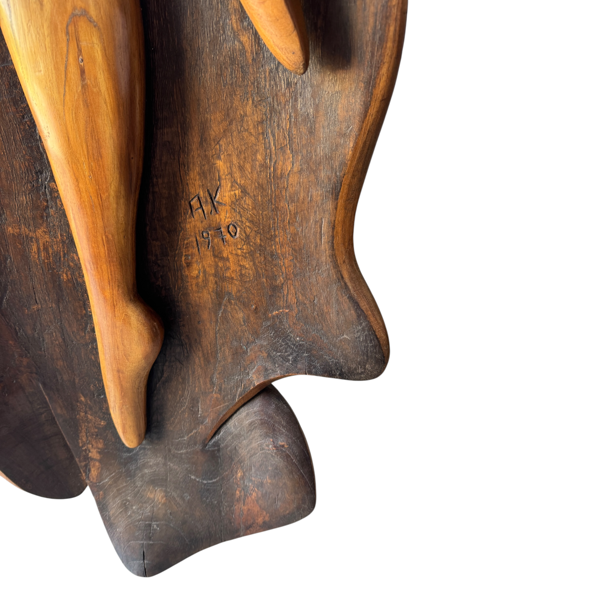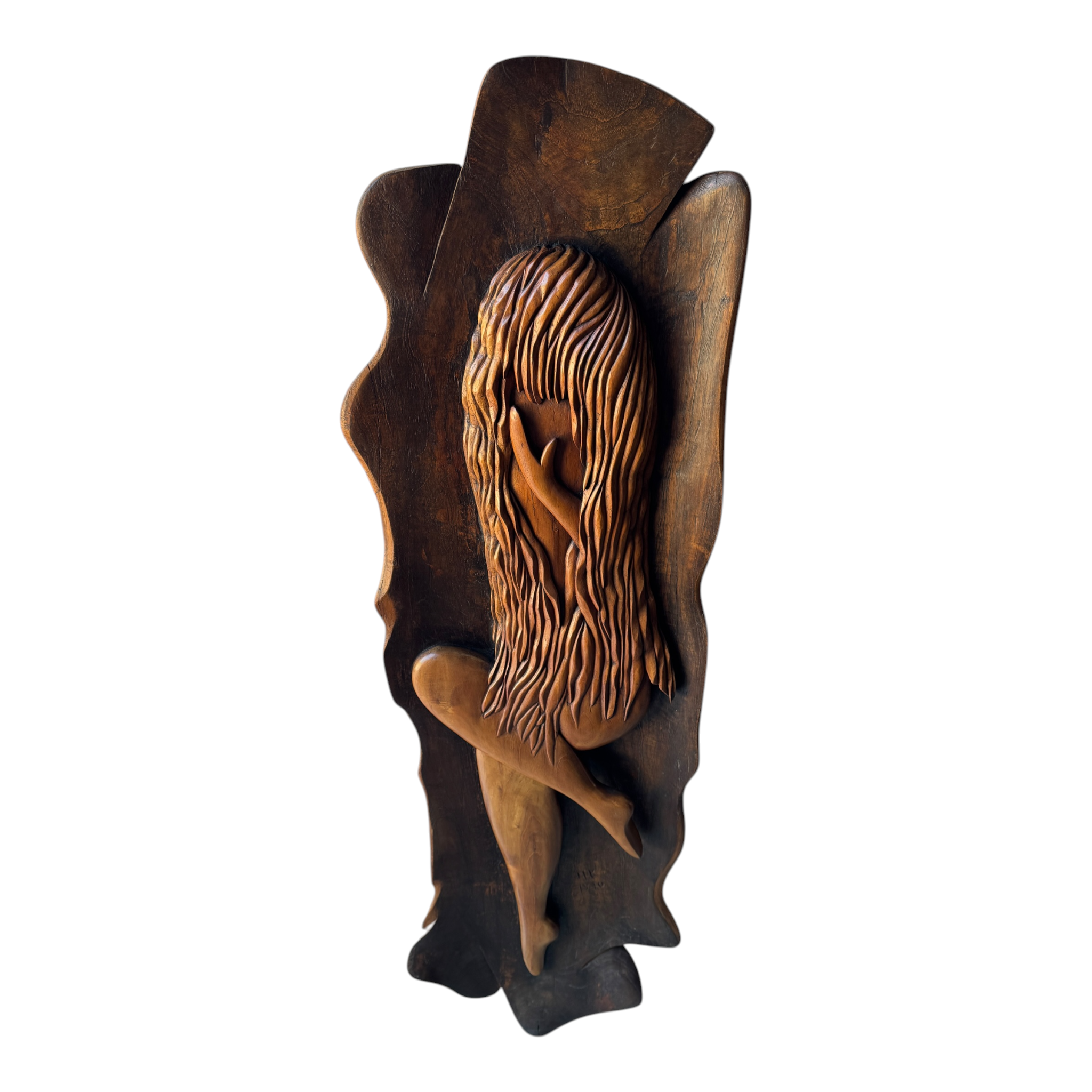 Esculpida a partir de una sola pieza de madera maciza, presenta un llamativo contraste de dos tonos que resalta la profundidad y la forma. El cuerpo de la mujer y su intrincado cabello están acabados en un tono de madera más claro y cálido, mientras que el fondo texturizado y orgánico está teñido en un rico nogal oscuro. La forma del panel de madera es libre e irregular, siguiendo la veta natural de la madera y enfatizando su origen artesanal.