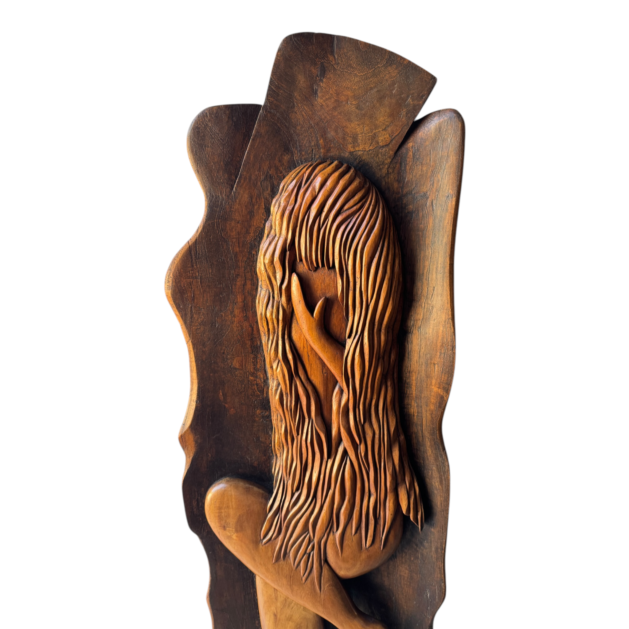 Esta es una impresionante y monumental talla de pared en madera hecha a mano que data de 1970, una pieza definitoria de la artesanía de mediados de siglo. La obra representa una figura femenina etérea y estilizada en una pose suspendida, caracterizada por su cabello extraordinariamente largo y fluido que envuelve elegantemente el cuerpo.