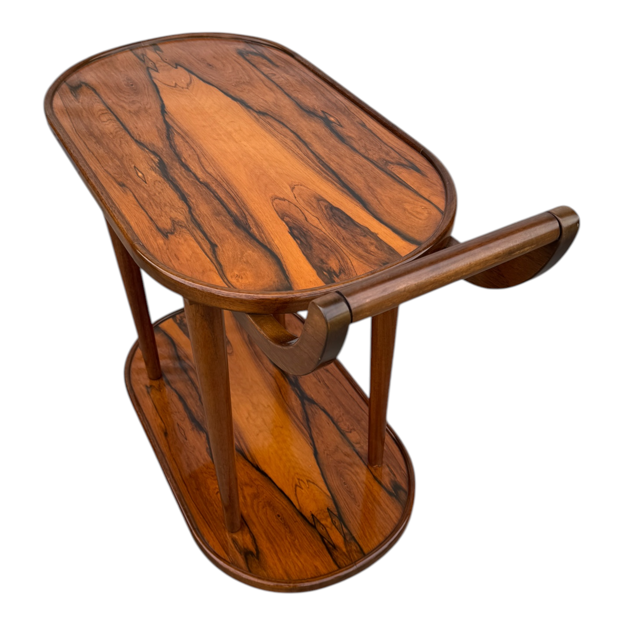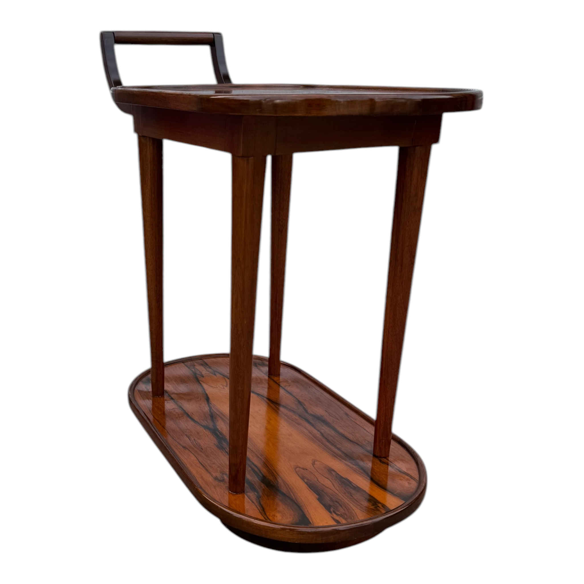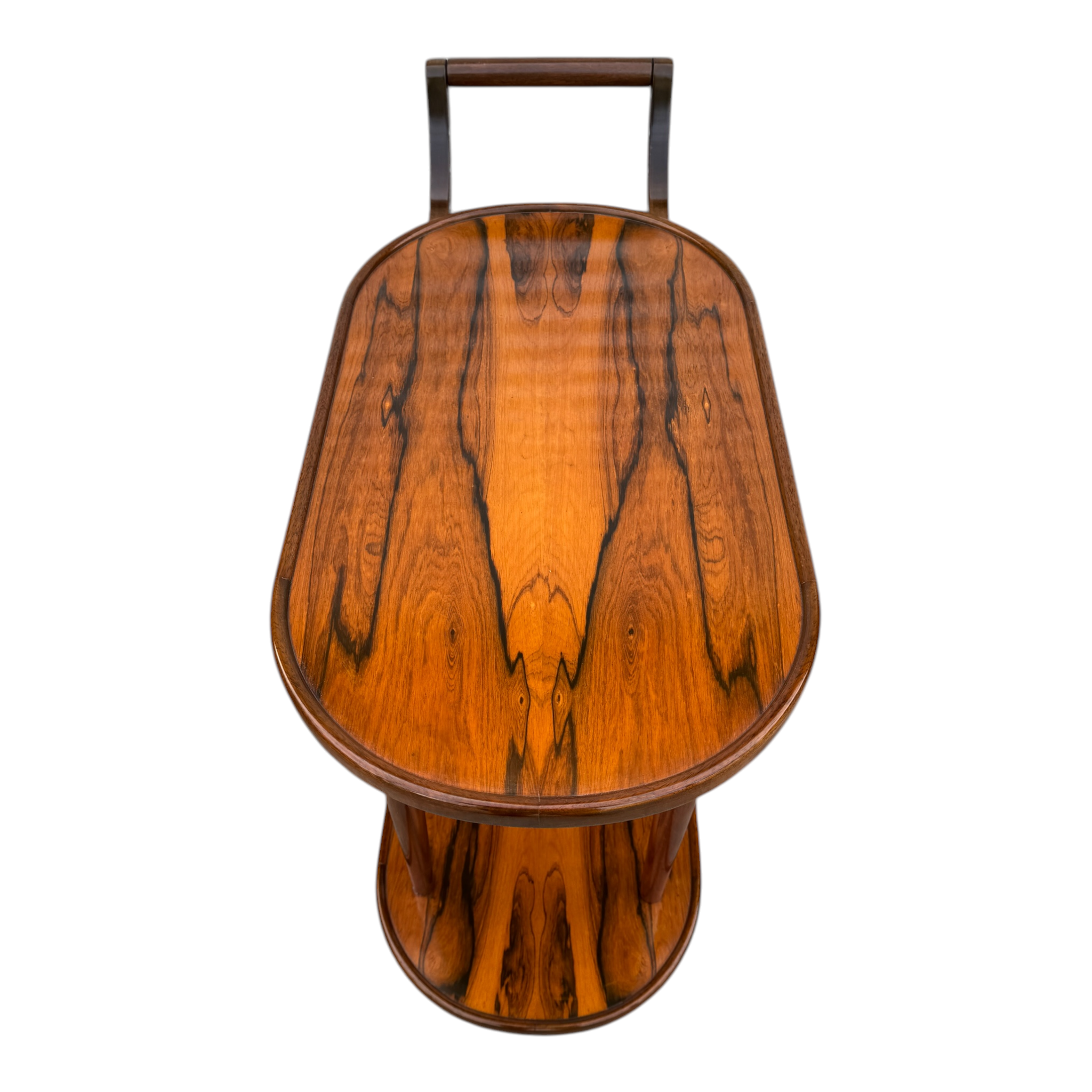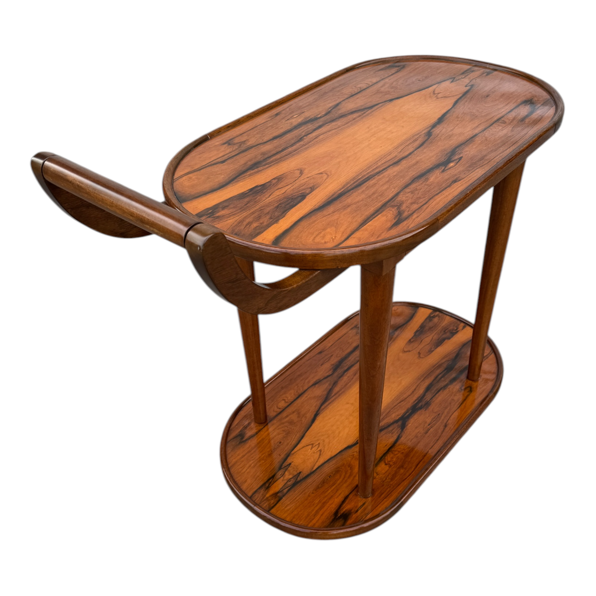Magnífico carro bar rodante de dos niveles, exponente del diseño de mobiliario de alta gama de mediados del siglo XX. La pieza destaca por su excepcional trabajo de ebanistería, utilizando chapas seleccionadas de Jacarandá de Río (Brazilian Rosewood), caracterizadas por un veteado de alto contraste que confieren un carácter gráfico único a las superficies.