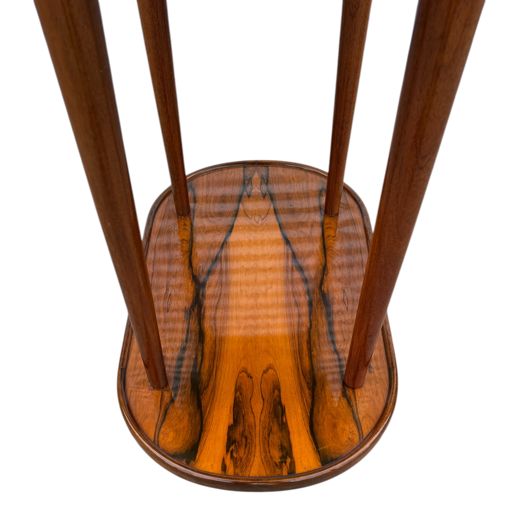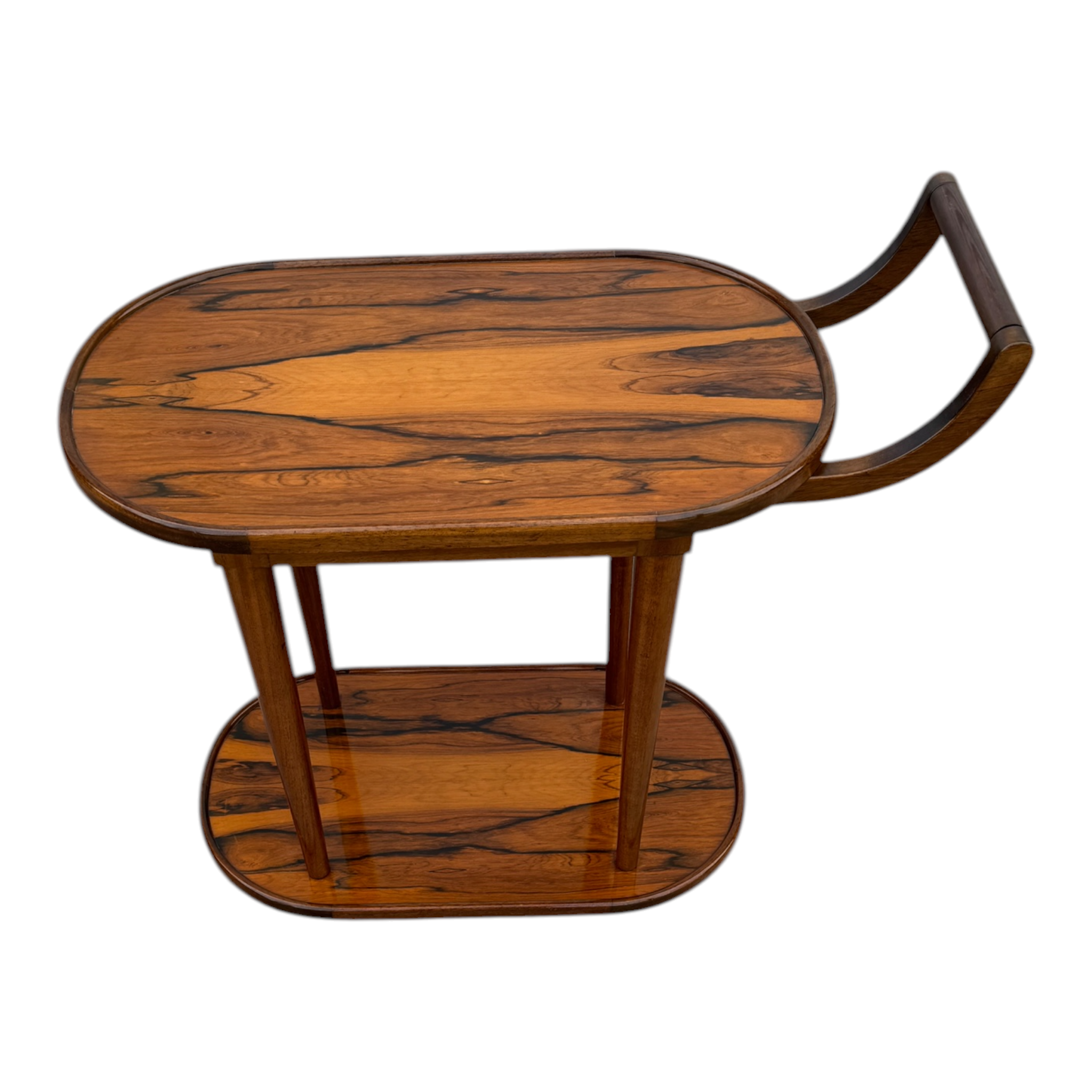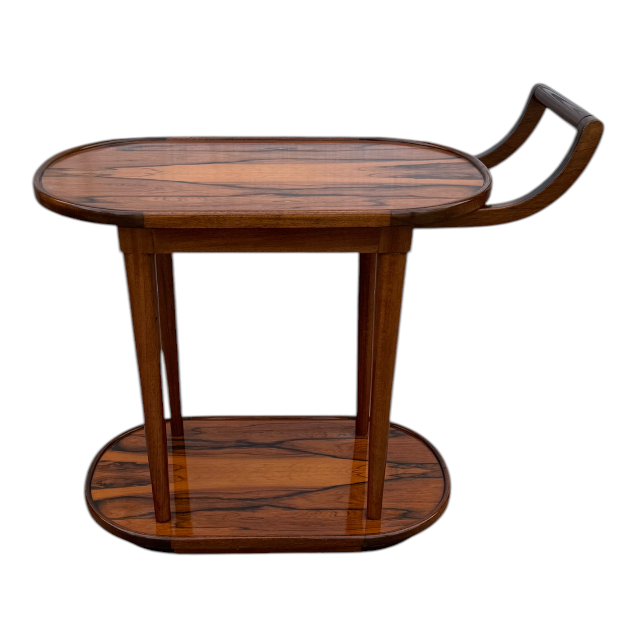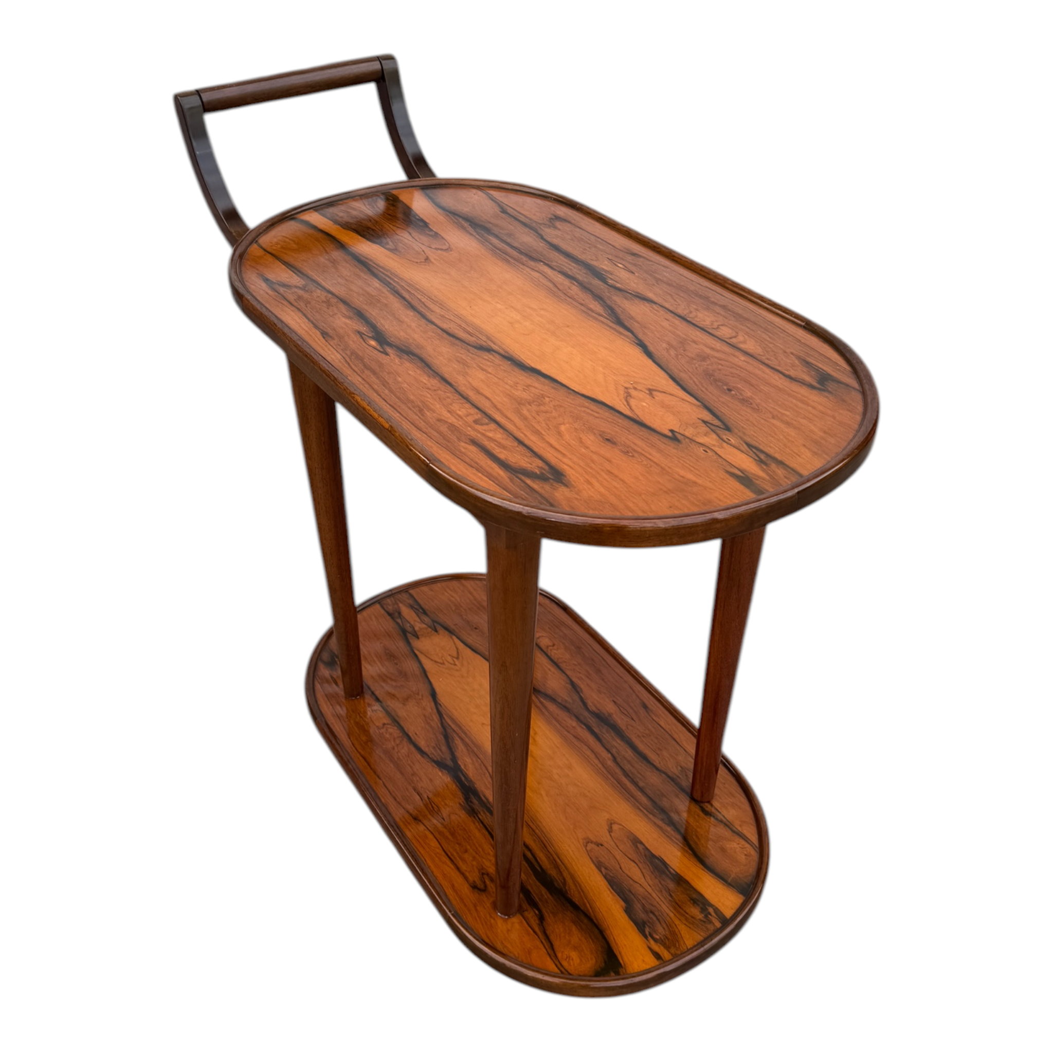 Magnífico carro bar rodante de dos niveles, exponente del diseño de mobiliario de alta gama de mediados del siglo XX. La pieza destaca por su excepcional trabajo de ebanistería, utilizando chapas seleccionadas de Jacarandá de Río (Brazilian Rosewood), caracterizadas por un veteado de alto contraste que confieren un carácter gráfico único a las superficies.