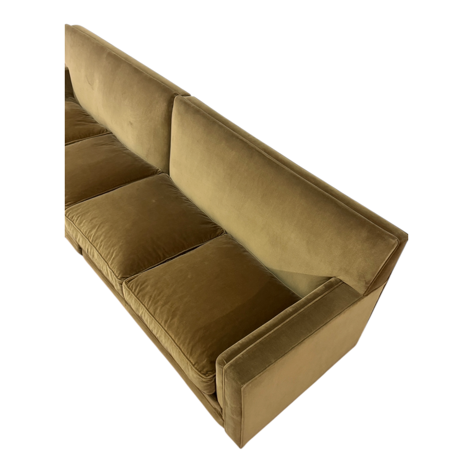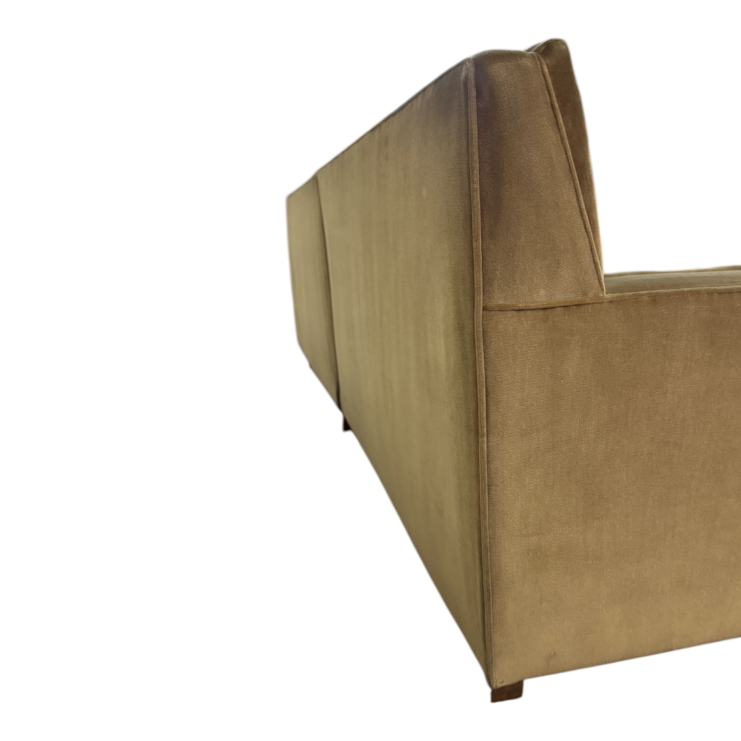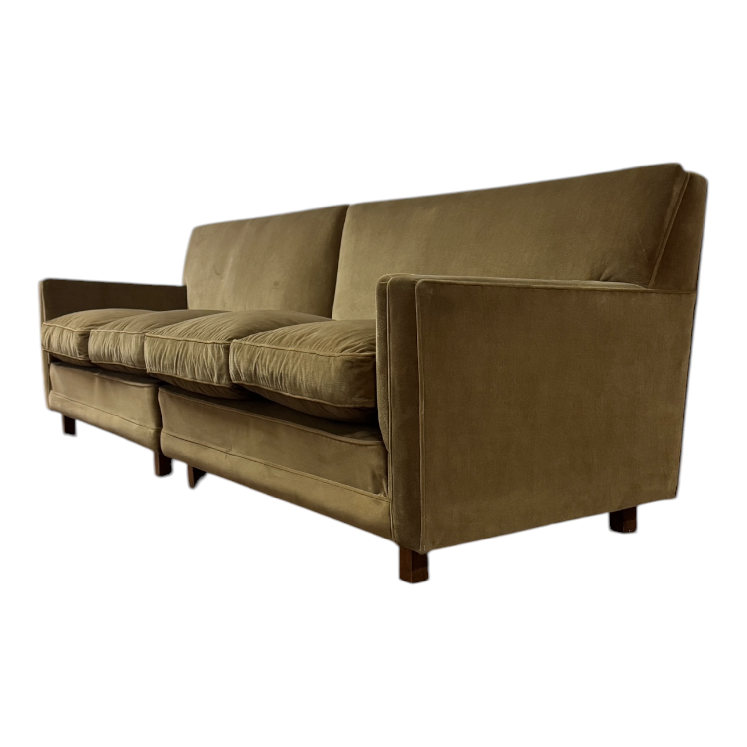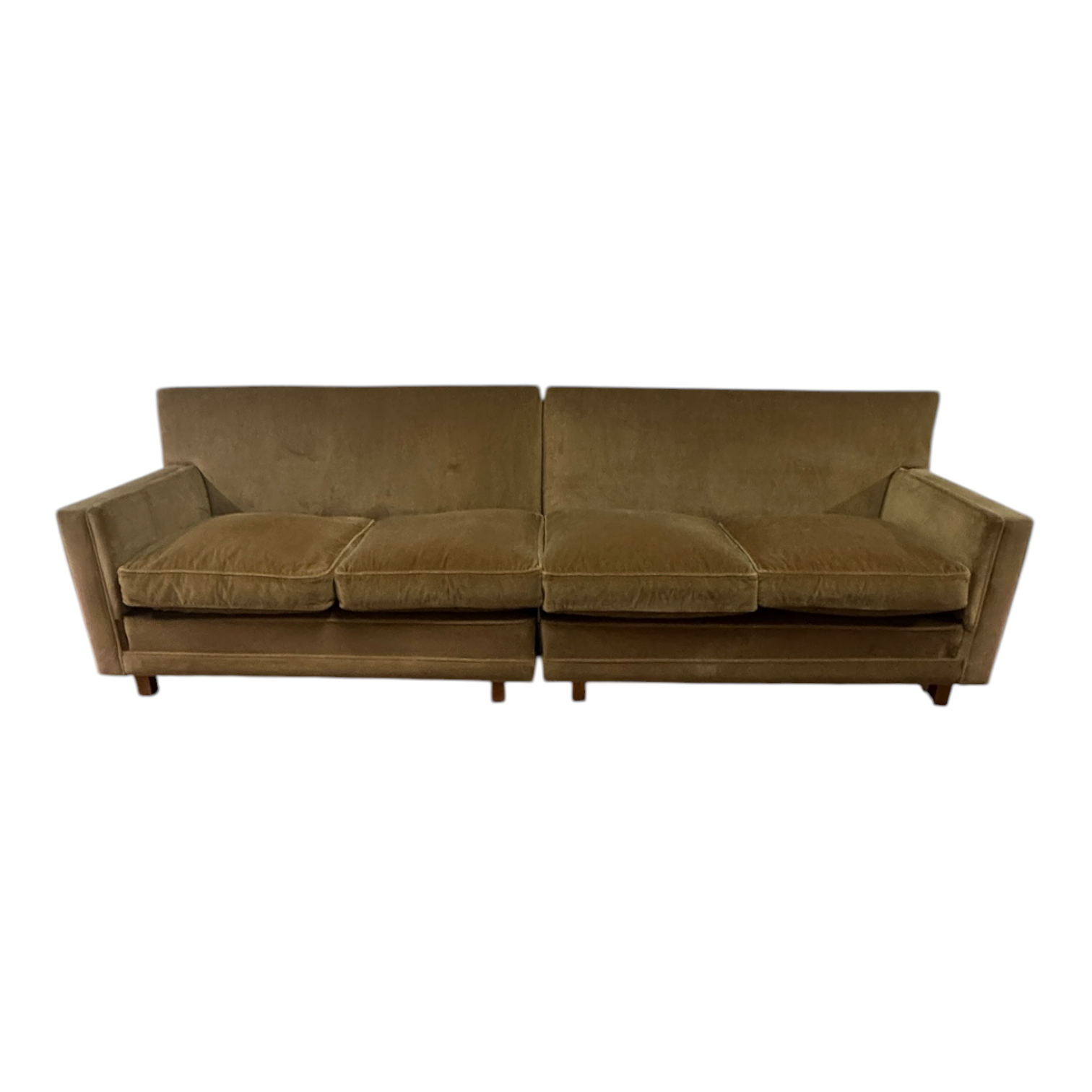 Este impresionante sofá de cuatro plazas es una pieza excepcional del diseño moderno de mediados de siglo (hacia 1960), que evoca la elegancia atemporal del estilo Jean-Michel Frank. Su diseño modular consiste en dos piezas simétricas que se unen para formar un imponente sofá de líneas limpias y proporciones equilibradas.