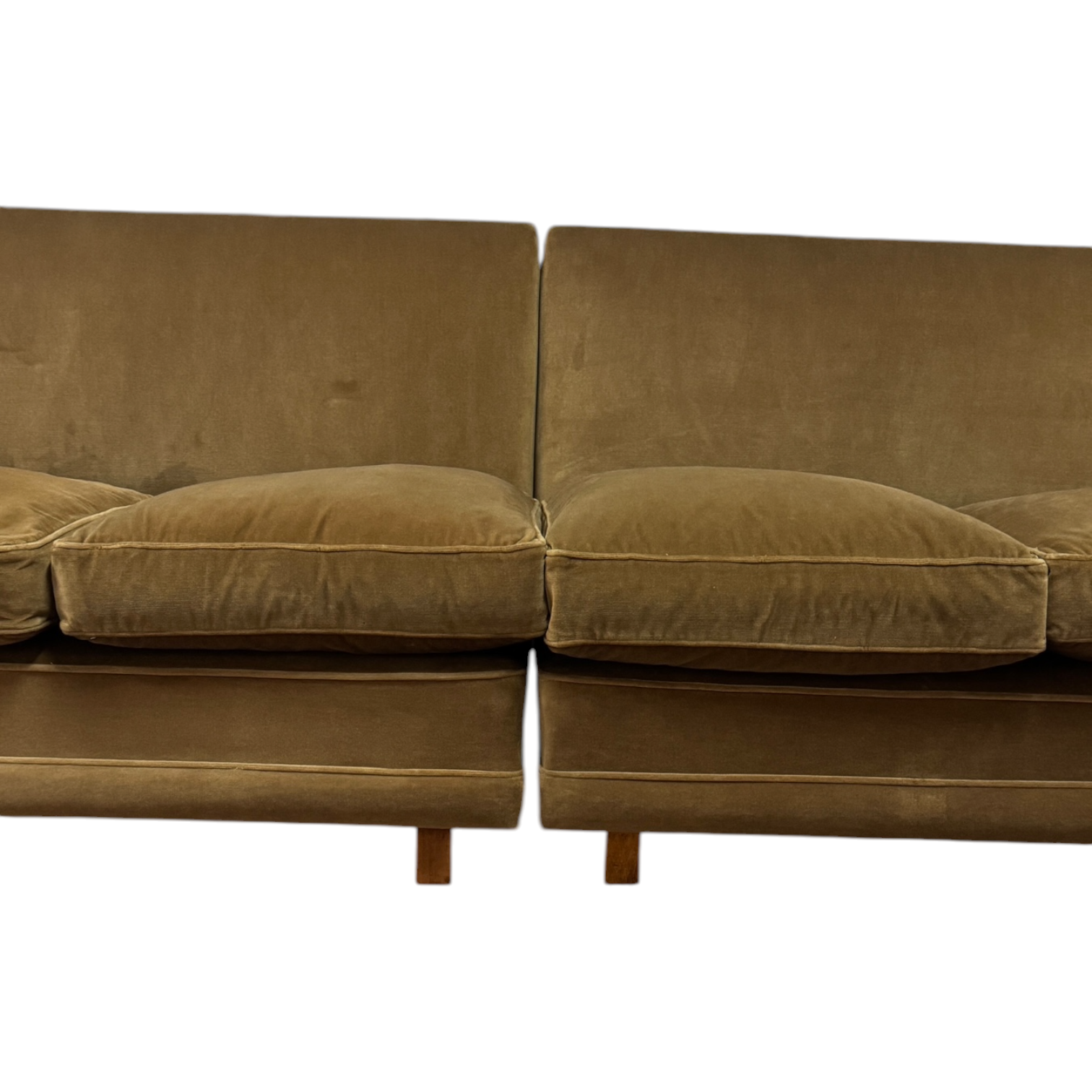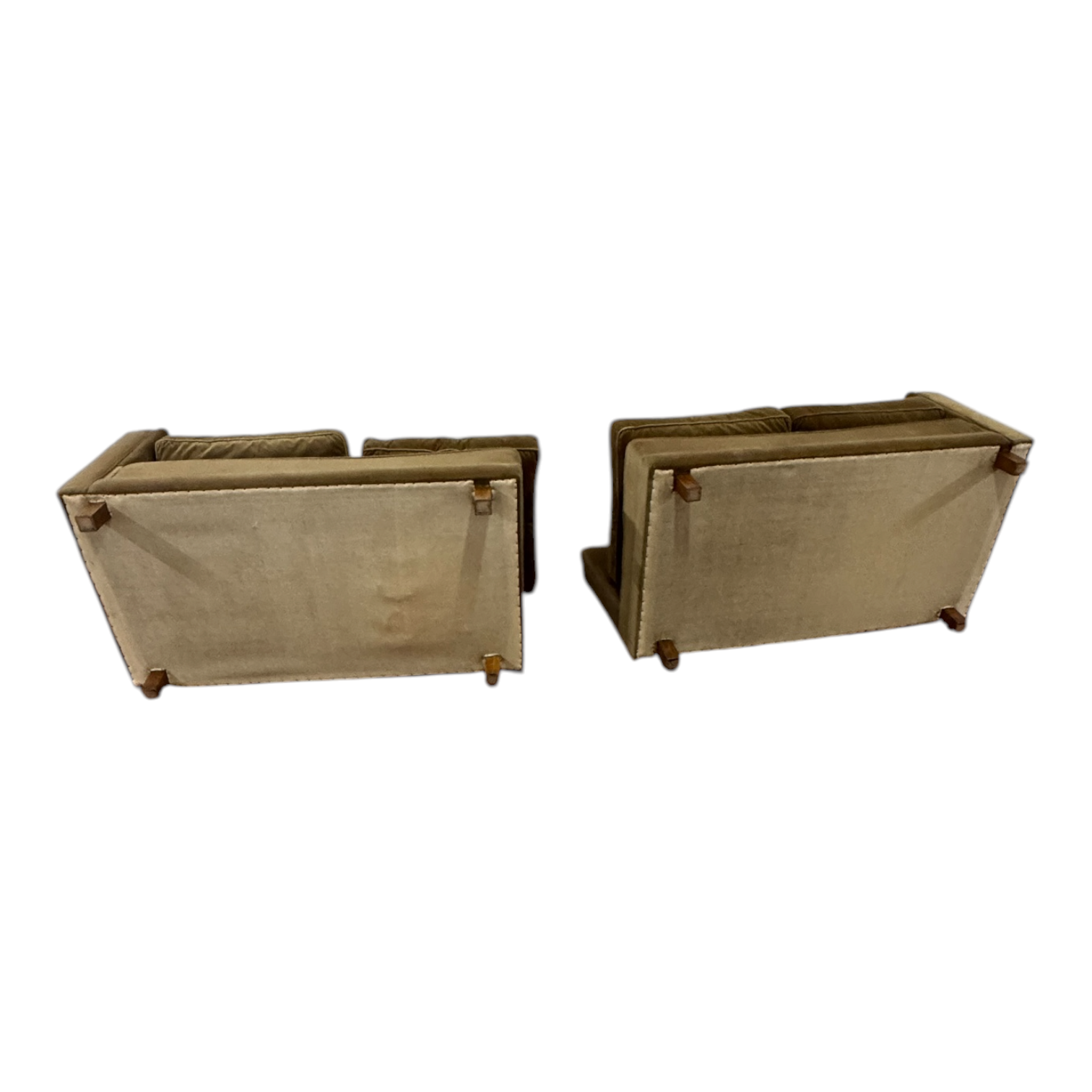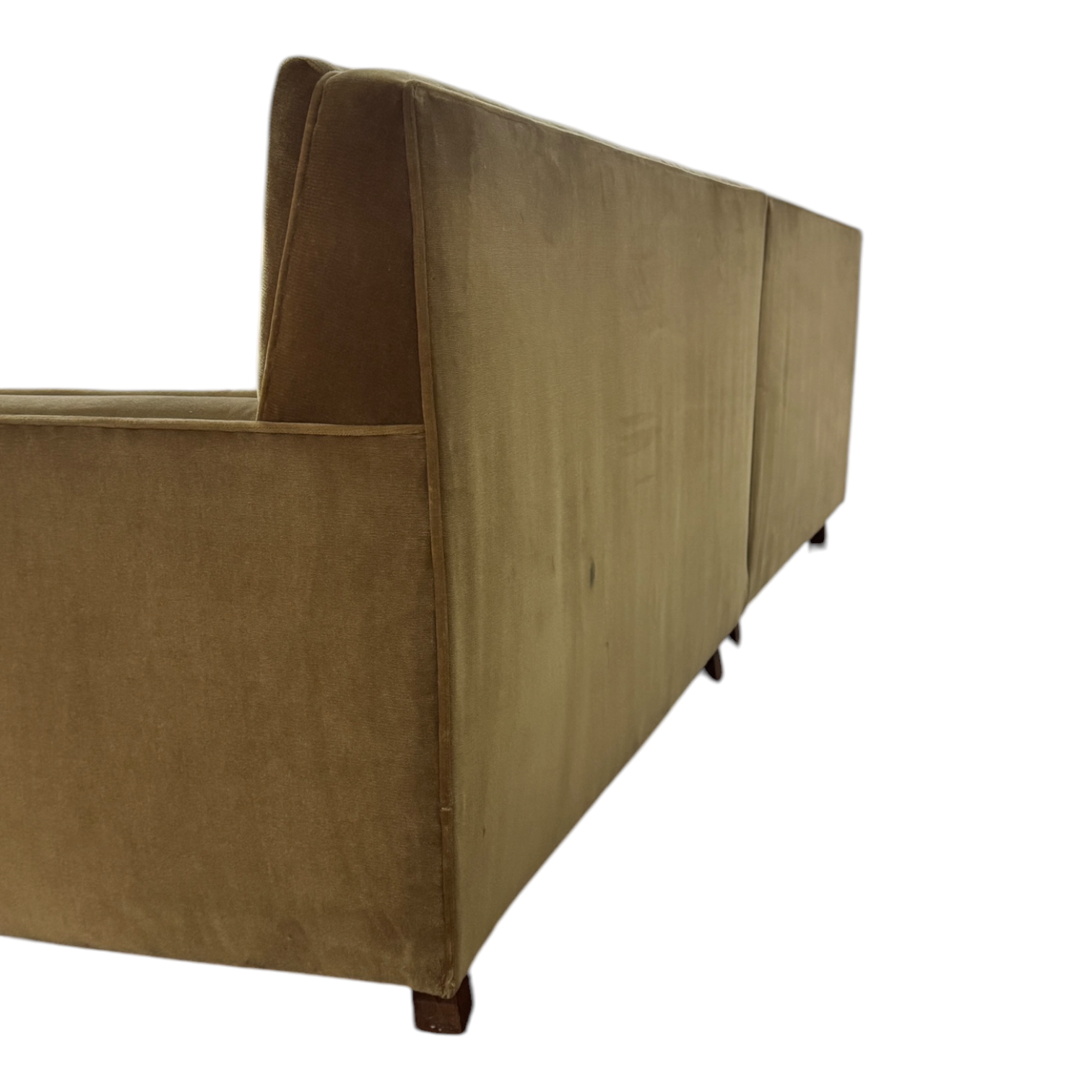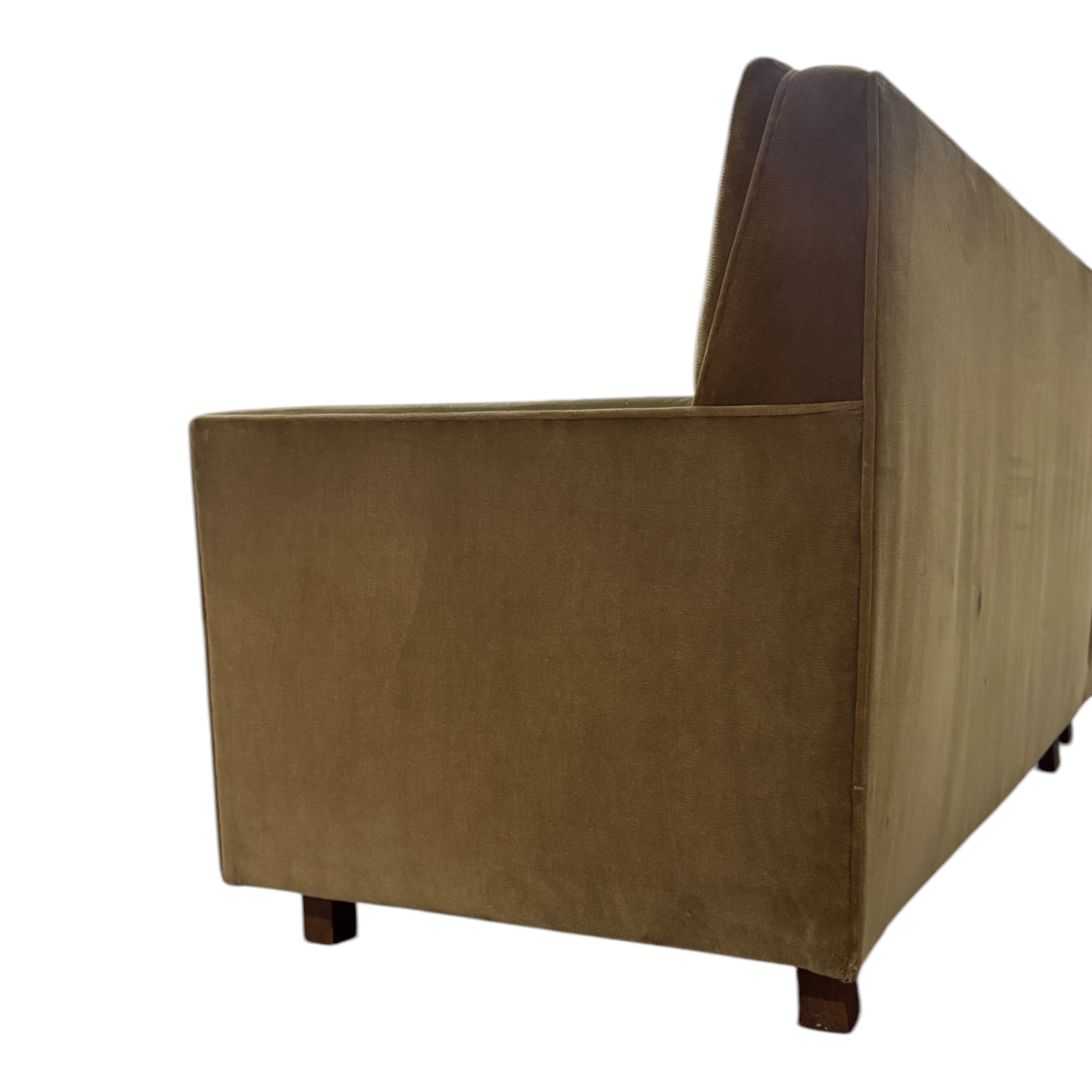 Estado y tapicería: El sofá conserva su tapicería original de pana (terciopelo de algodón) en un característico color verde oliva. La tela está en muy buen estado general, aunque presenta la pátina natural y las marcas propias de su edad, que refuerzan su autenticidad y carácter vintage.