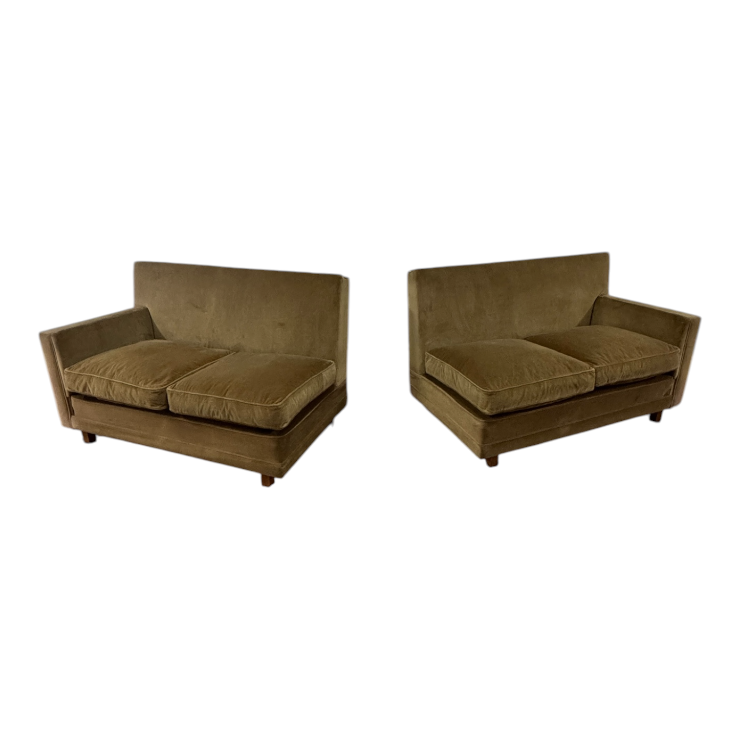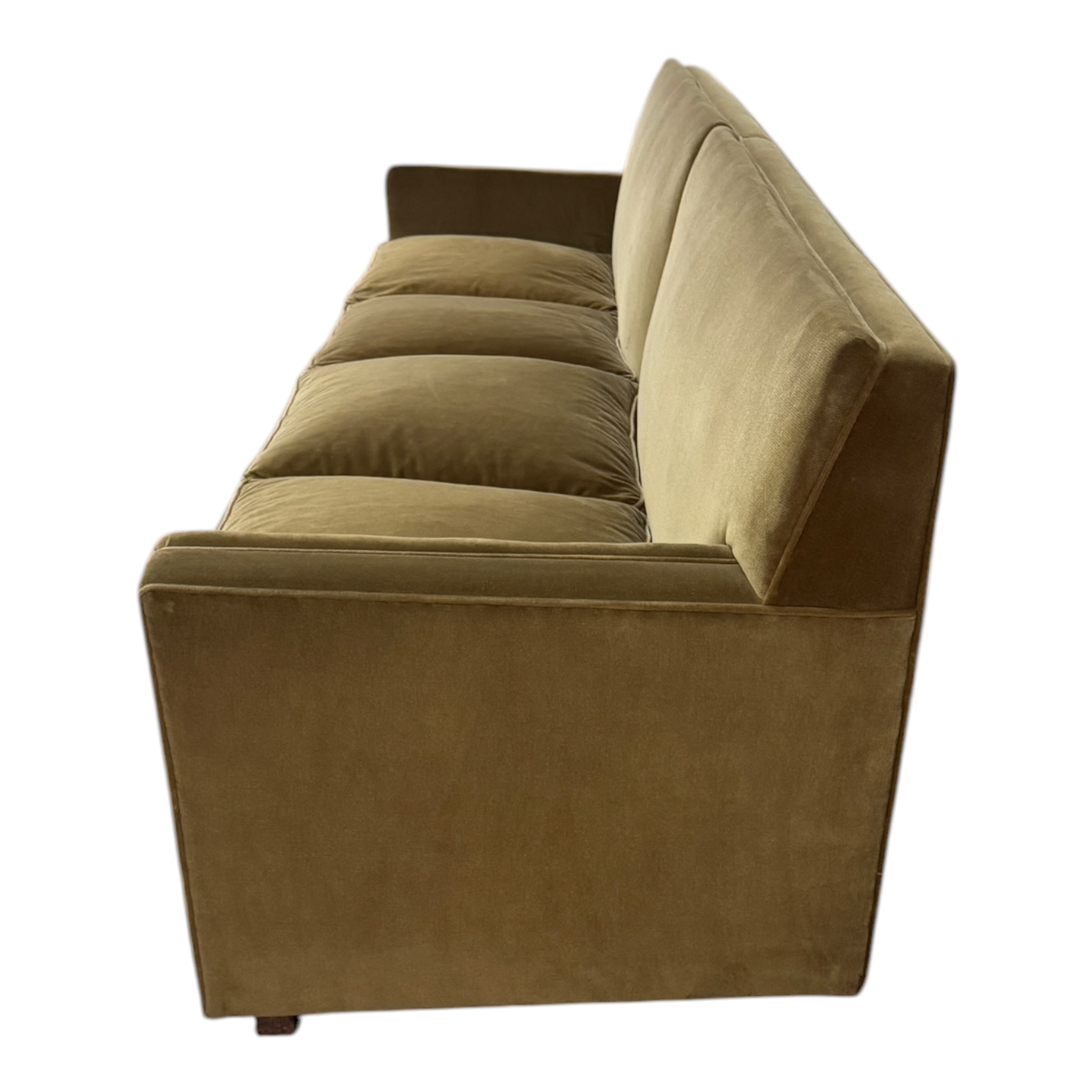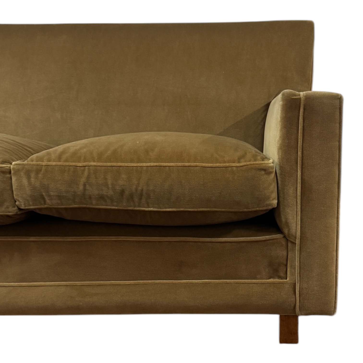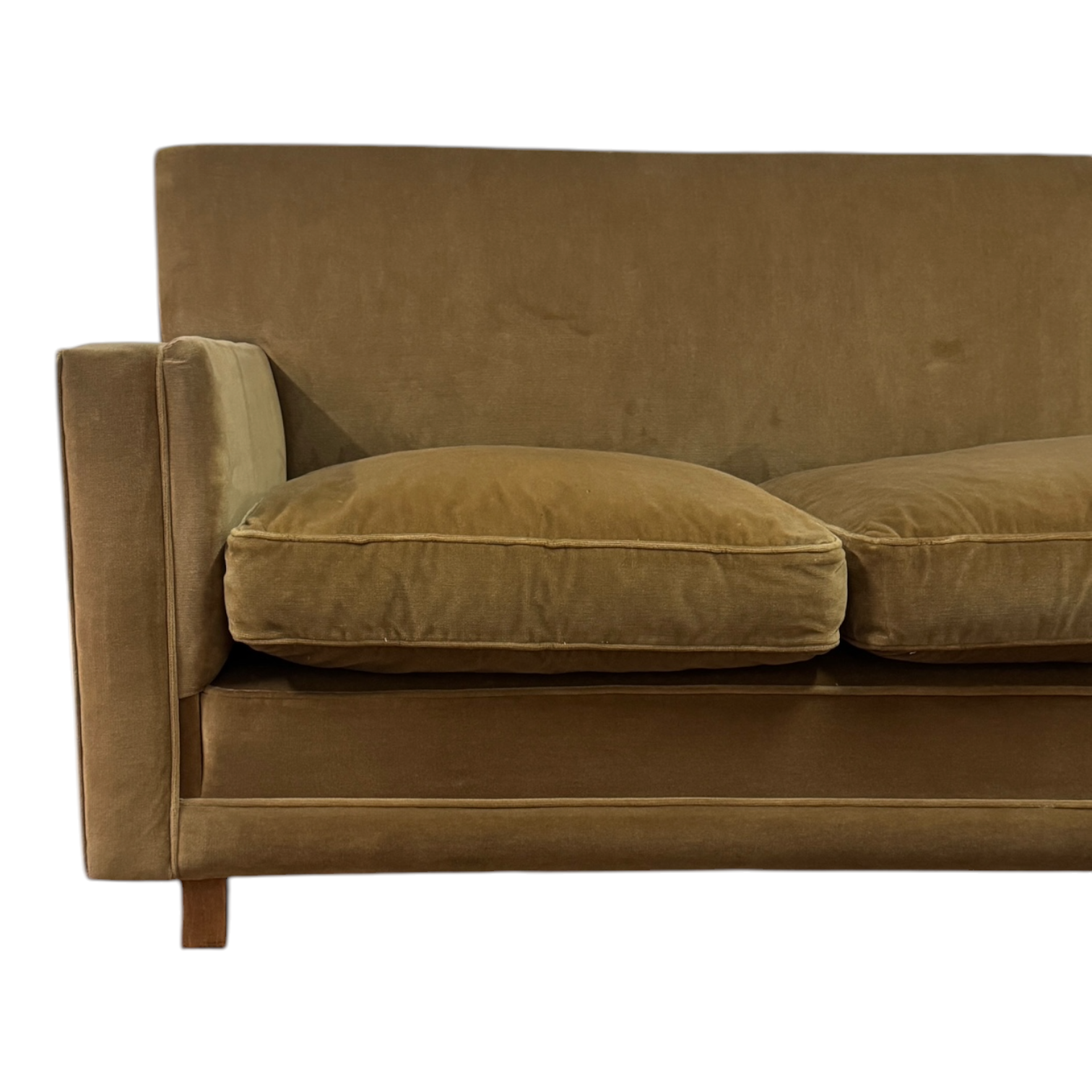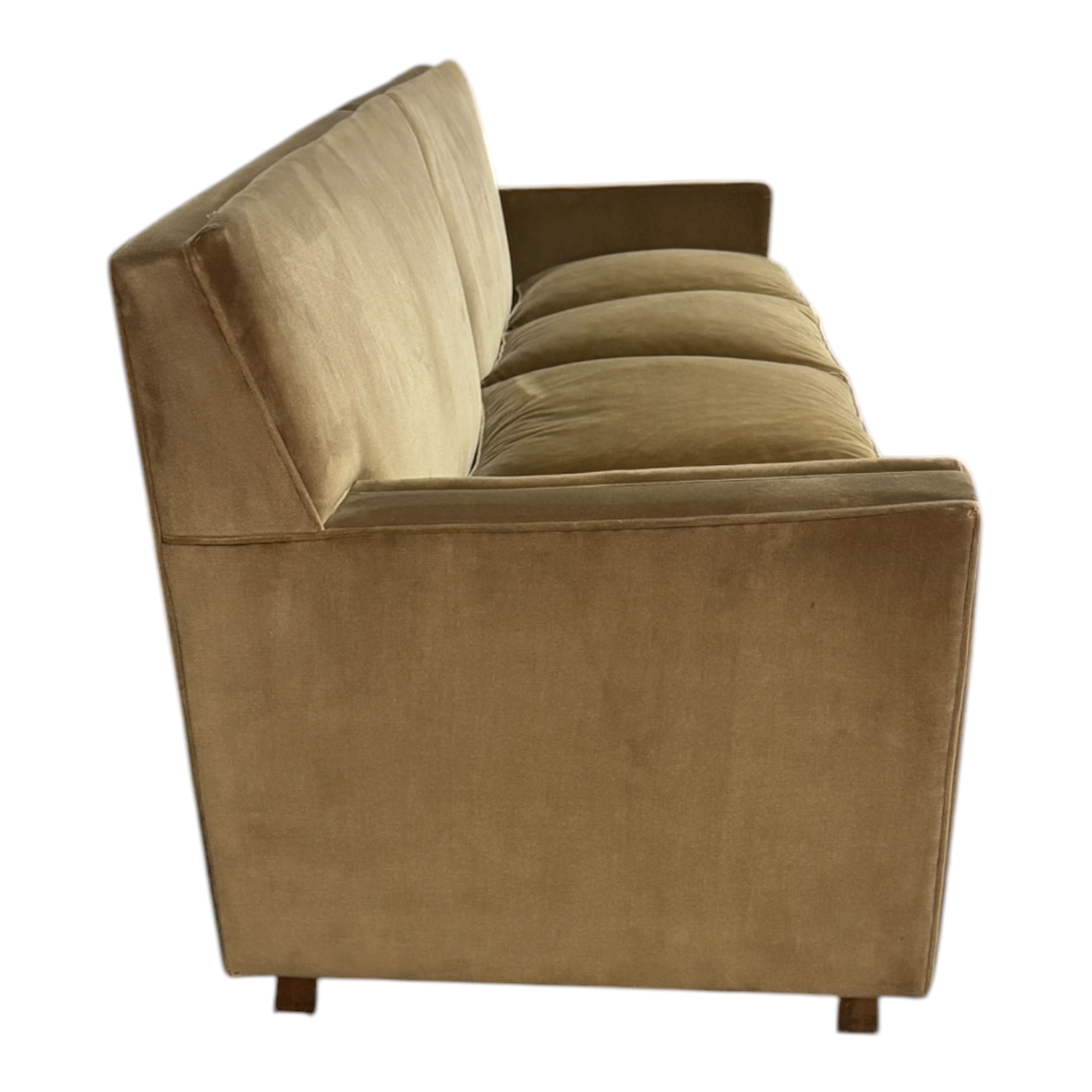 Estado y tapicería: El sofá conserva su tapicería original de pana (terciopelo de algodón) en un característico color verde oliva. La tela está en muy buen estado general, aunque presenta la pátina natural y las marcas propias de su edad, que refuerzan su autenticidad y carácter vintage.